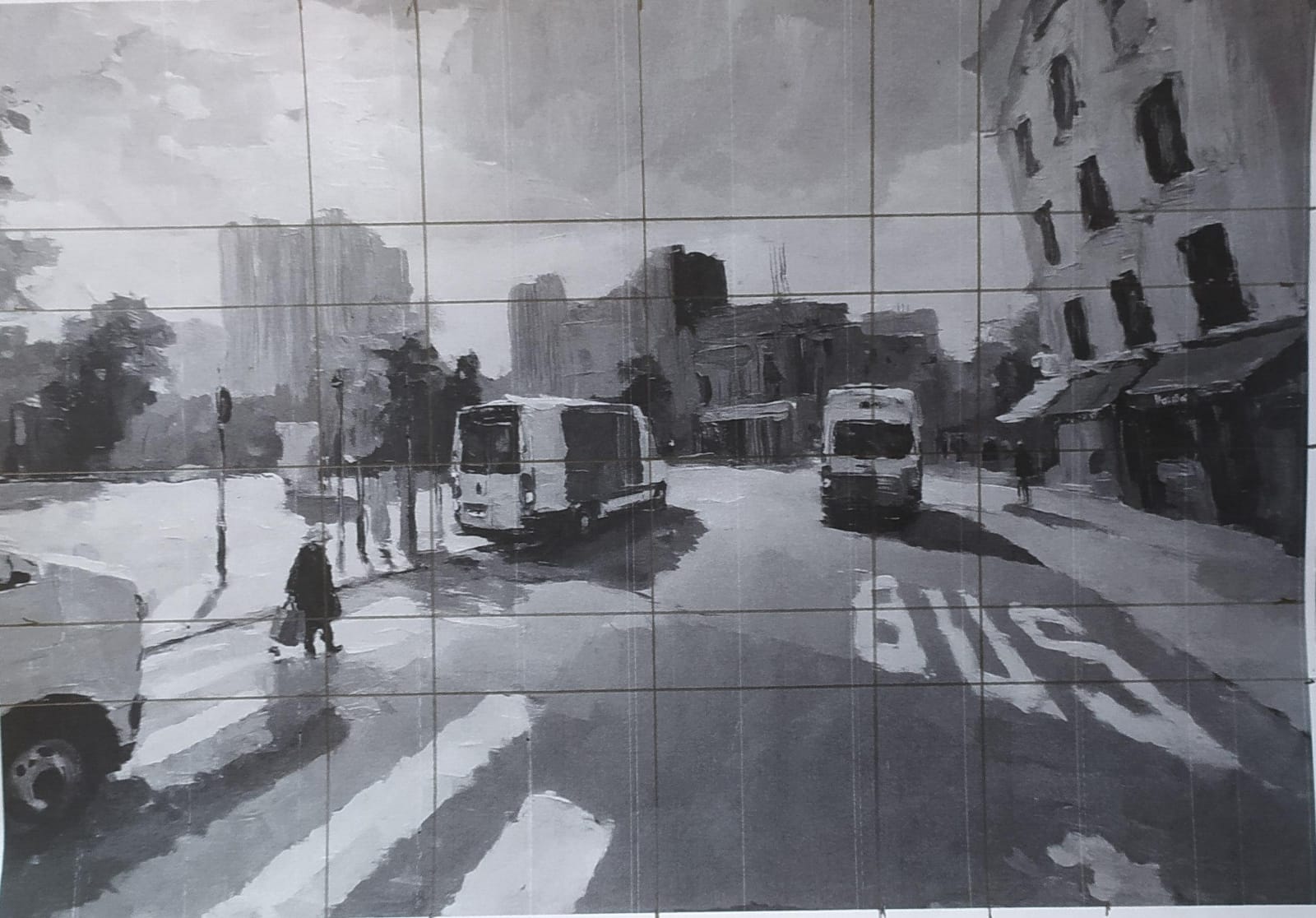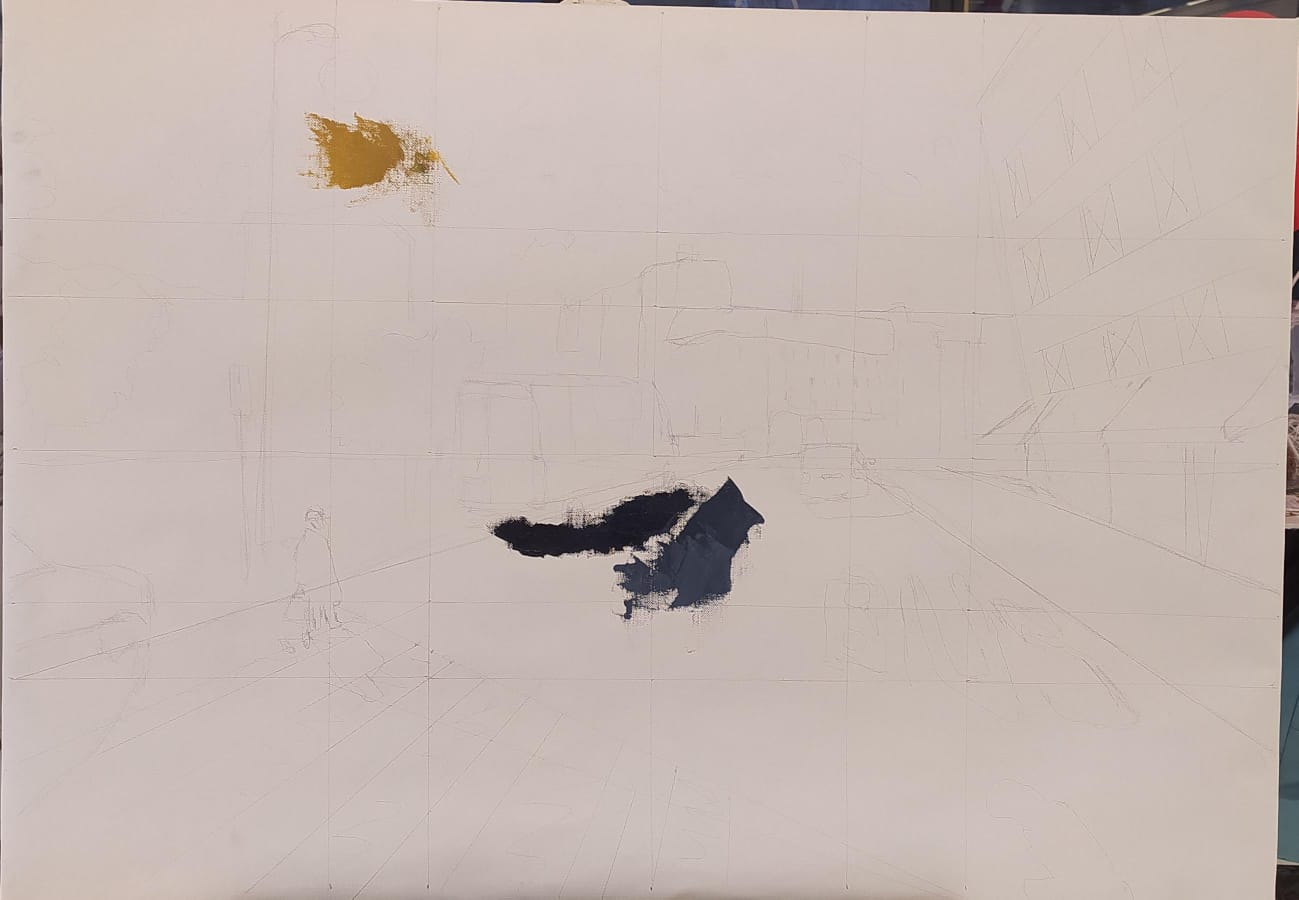 D’ordinaire, je ne fais pas de report de proportions sur mes toiles avant de peintre, je ne dessine que rapidement au crayon gris les personnages/éléments principaux sommairement. Pour cette peinture qui va faire 100x70cm, j’ai reporté quelques lignes afin de ne pas trop destructurer le modèle (on peut y voir les lignes des tiers et des quarts) :