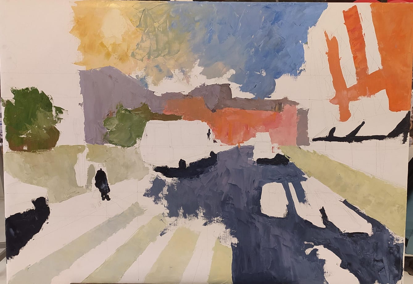 Et les lignes reportées sur la toile avec le griffonné des éléments principaux :