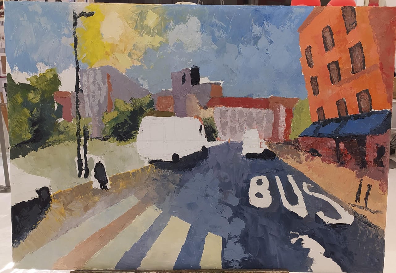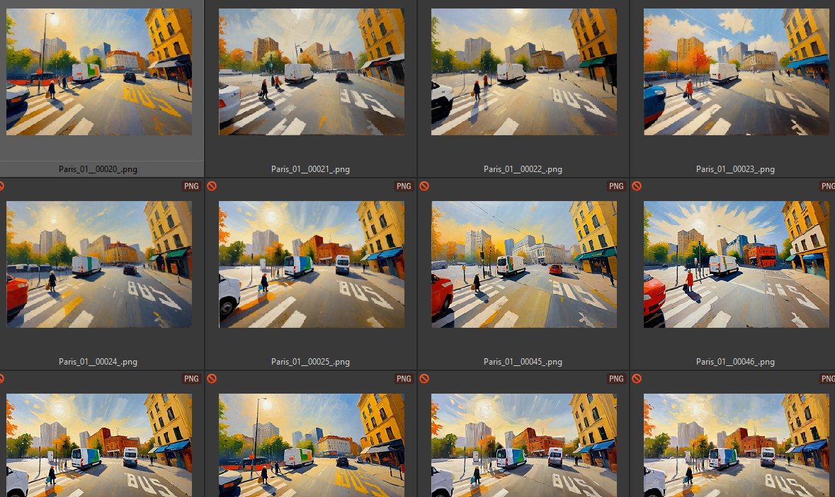 De mes images générées par IA, j’imprime une version en noir et blanc afin d’avoir une échelle de valeurs. J’imprime quelques petites versions en couleur afin de disposer de différents éléments d’intérêt. Lorsque je peins, je mélange les sources.